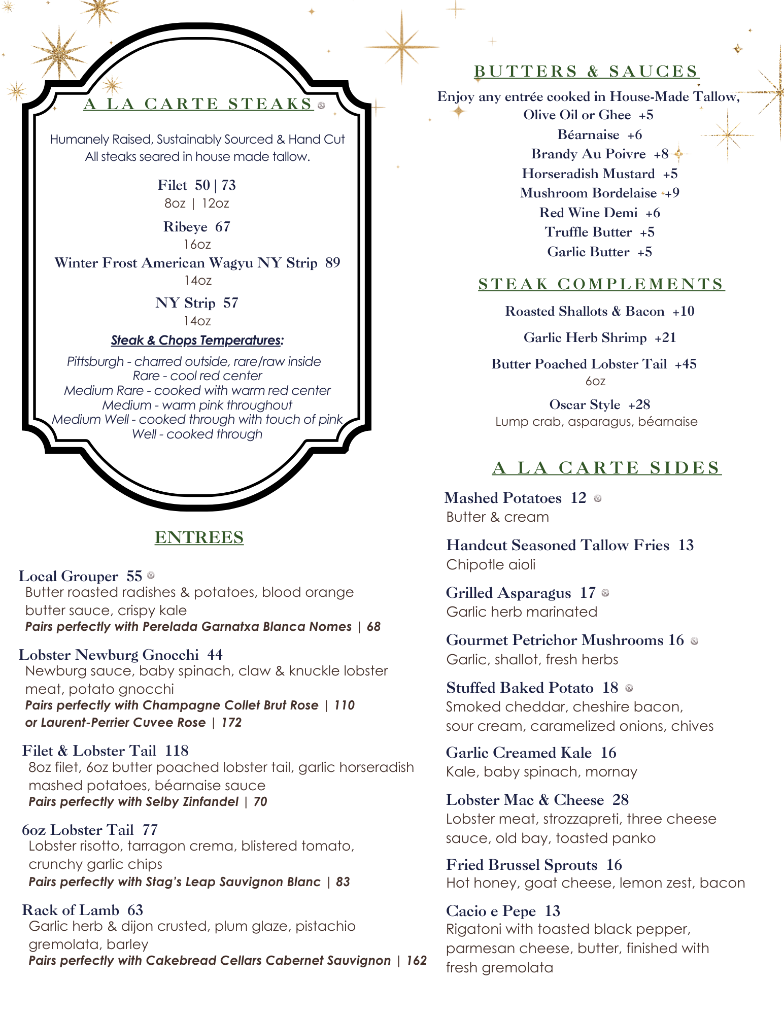 Signature steaks, local seafood, house-made pastas, and festive seasonal features.