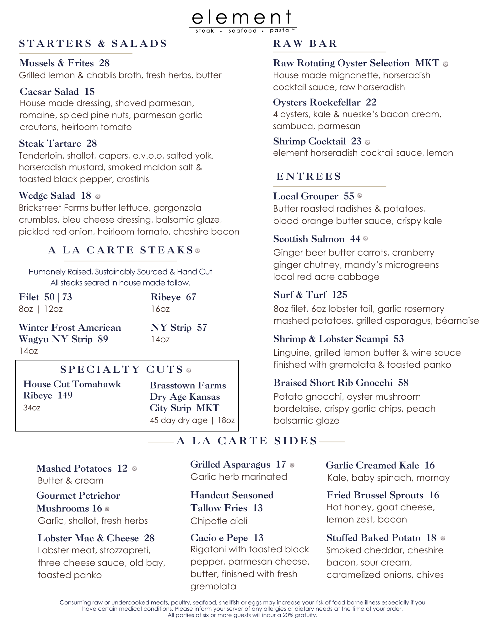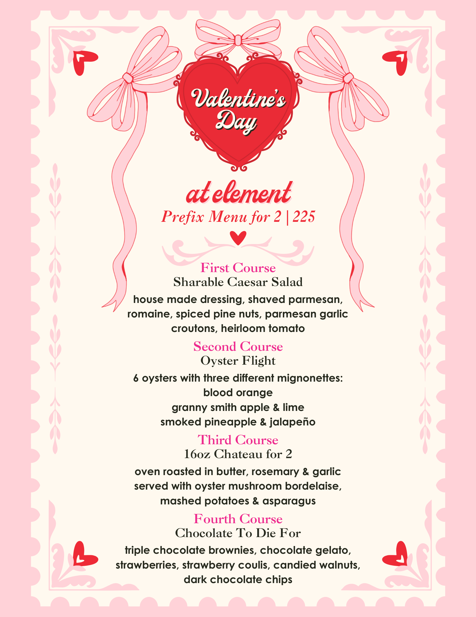 Valentine’s Day reservations at element fill quickly and availability is limited. We strongly encourage booking in advance to secure your preferred dining time.